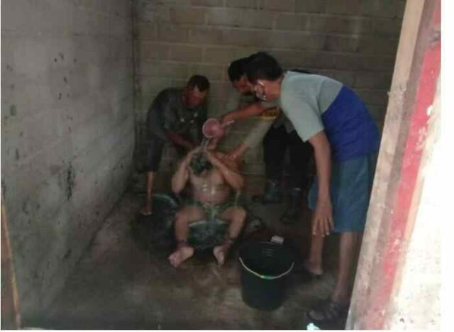 Saya bersama Kepala kampung dan di bantu perangkat lainya untuk memandikan Supriyanto yang sudah lama tidak mandi di karenakan sering mengamuk. Imbuhnya
