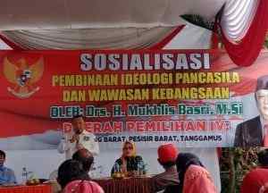 TANGGAMUS – Masih dalam Memperingati Hari Lahir Pancasila, anggota Dewan Perwakilan Rakyat Daerah (DPRD) Provinsi Lampung Mukhlis Basri, mensosialisasikan Pembinaan Ideologi Pancasila Dan Wawasan Kebangsaan, di pekon Gisting atas, Kecamatan Gisting Kabupaten Tanggamus. Rabu (04/08/2021).