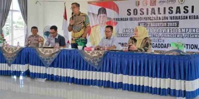 METRO – Anggota DPRD Provinsi Lampung, Tondi Muammar Ghadafi Nasution, kembali menggelar Sosialisasi Pembinaan Ideologi Pancasila dan Wawasan Kebangsaan di Kelurahan Sumbersari, Kecamatan Metro Selatan, Sabtu, 23 Agustus 2025.