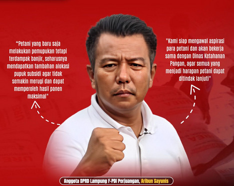 Anggota DPRD Lampung Fraksi PDI Perjuangan, Aribun Sayunis mendorong upaya penambahan pupuk subsidi bagi petani yang terdampak banjir, khususnya di Kecamatan Palas, Kabupaten Lampung Selatan.