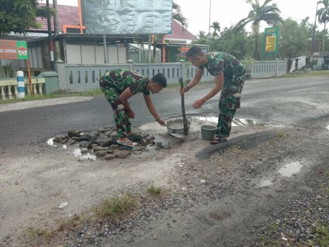 Beberapa personel dilibatkan dalam kegiatan karya bakti yang dilakukan , karena mengingat jalan poros disekitar koramil perlu mendapatkan perawatan karena mengalami rusak berlubang dan sangat menggangu aktivitas para pengguna jalan.