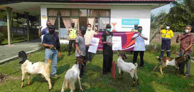 Tanjung Bintang – Coca-Cola Europacific Partners Lampung bersama Forum Ternak Kampung Kambing Sukanegera melakukan simbolis serah terima bantuan hewan qurban kepada panitia mesjid penyelenggara pemotongan hewan qurban di Desa Sukanegara, Senin (19/7/2021).