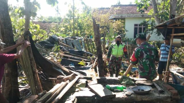 Onlinekoe.com – Pembersihan lapak ikan milik Sdr Yoyos Suwondo yg di kelola oleh Sdr Suparno yang bertempat di Dsn Jatirejo Ds Kagungan Ratu Kec.Negeri Katon kab.Pesawaran, akibat kencang nya Hujan yang di setai angin mengakibatkan Lapak ikan dan genteng rumah warga rontok kebawa angin dan salah satu rumah warga desa tertimpa pohon tumbang , melihat kondisi bangunan rumah warga dan lapak ikan yang hancur koramil 421-02-Gdt langsung mengerahkan 4 orang Babinsanya untuk turun tangan membantu warga yang rumahnya hancur akibat derasnya hujan di sertai angin kencang, di bantu dengan pihak polsek ,Sekcam Negeri Katon, Kadus Jatirejo , Ketua Rt Jatirejo, dan warga masyarakat sekitar, Jumat (16/04/2021).