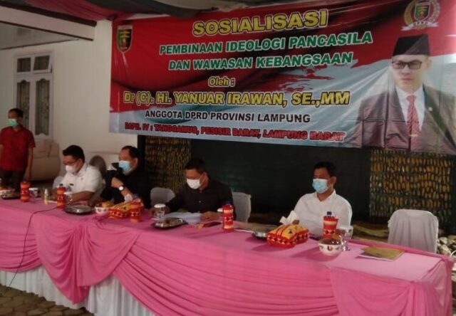 Onlinekoe.com, Bandar Lampung – Anggota DPRD Provinsi Lampung Komisi V, Dr (C). Hi Yanuar Irawan, SE, MM menggelar sosialisasi Pembinaan Ideologi Pancasila dan Wawasan Kebangsaan. Acara di gelar di rumah dinas Ketua DPRD Tanggamus, Sabtu (28/02/2021).
