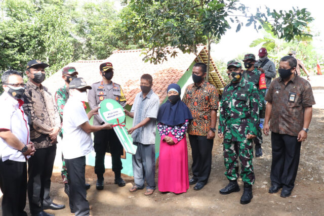 Onlinekoe, Banjarnegara – Bupati Banjarnegara Budi Sarwono menyerahkan kunci rumah RTLH Program Tentara Manunggal Membangun Desa (TMMD) Reg 111 TA 2021. Kodim 0704/Banjarnegara (14/7) telah selesai desa Kebutuhjurang Kecamatan Pagedongan Kabupaten Banjarnegara, Jawa Tengah. Jumat (16/7/21).