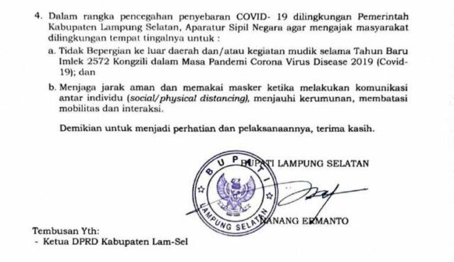 Larangan tersebut tertuang dalam Surat Edaran (SE) Bupati Lampung Selatan Nomor 04 Tahun 2021 yang berisi tentang Pembatasan Kegiatan Berpergian Ke Luar Daerah Bagi Aparatur Sipil Negara Selama Libur Tahun Baru Imlek 2572 Kongzili Dalam Upaya Pencegahan Penyebaran COVID-19 Di pemerintah Kabupaten Lampung Selatan.