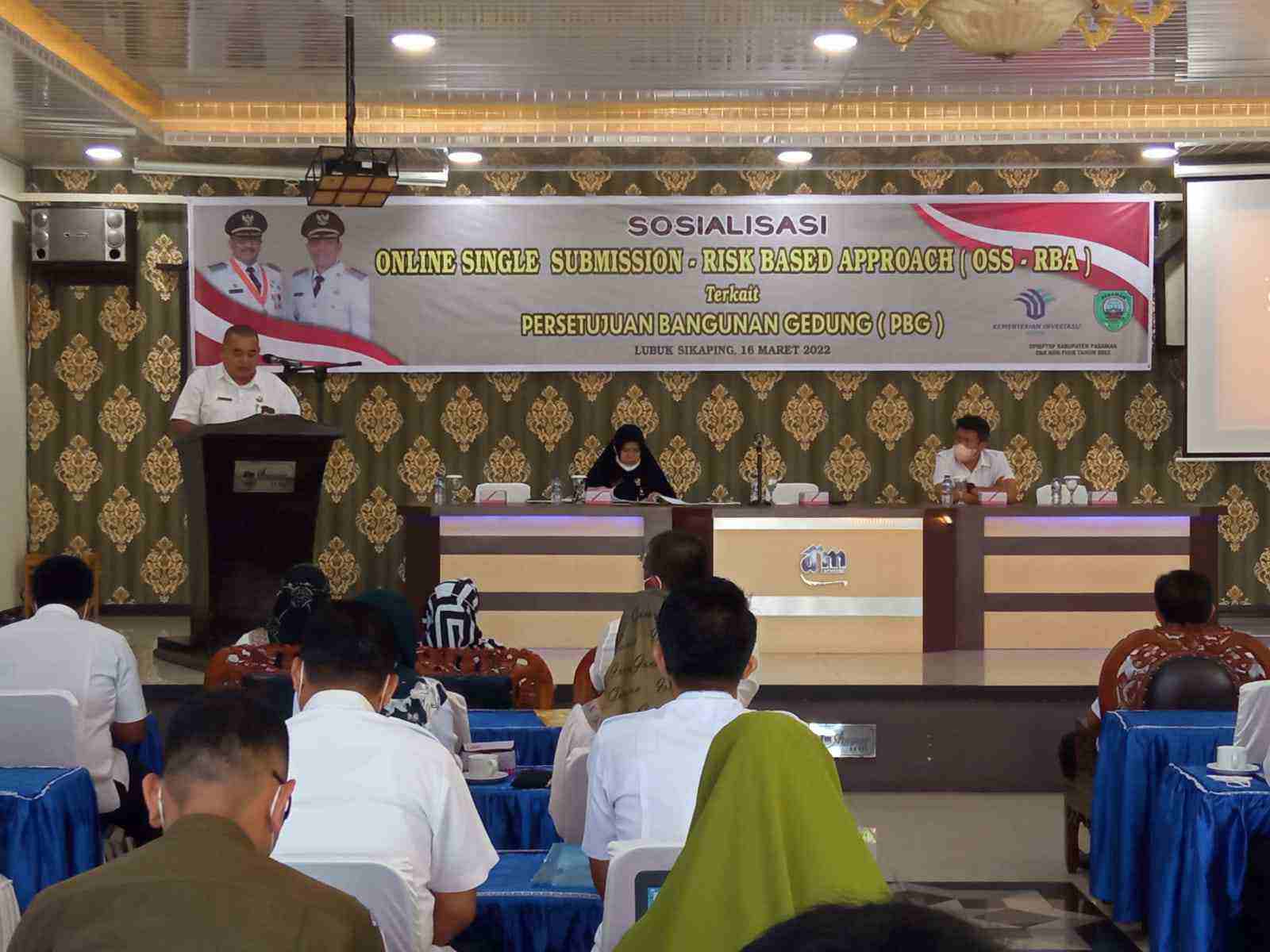 Onlinekoe.com | Pasaman — Bupati Pasaman H Benny Utama SH MH yang di wakili Asisten ll Rosben Aguswar membuka secara resmi Sosialisasi Online Single Submission – Risk Based Approach (OSS-RBA) terkait Persetujuan Bangunan Gedung di dinas Penanaman Modal dan Pelayanan Terpadu Satu Pintu di gedung pertemuan Arumas Hotel, kabupaten Pasaman, Sumbar, Rabu 16 Maret 2022.