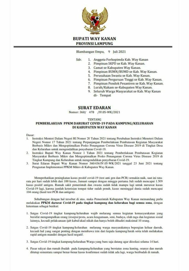 Sehubungan dengan hal tersebut di atas, maka Pemerintah Kabupaten Way Kanan memandang perlu melakukan PPKM darurat Covid-19 pada tingkat kampung dan kelurahan bagi semua zona, dengan ketentuan sebagai berikut: