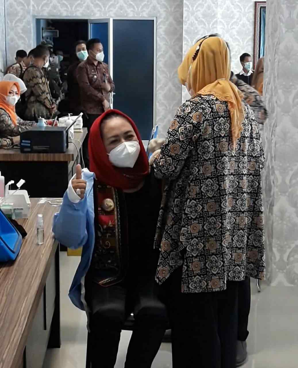 Dalam Kegiatan Simbolis Penyuntikan Vaksinasi DiProvinsi Lampung Bupati Tulangbawang Hj.Winarti Didampingi Sekretaris Daerah kabupaten Tulang Bawang, Kadis Kesehatan , Kadis dispora dan Kabag Protokol kabupaten tulang Bawang. (ADV)