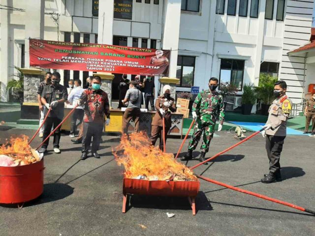 Onlinekoe.com – Di halaman Kantor Kejaksaan Negeri Kalianda Lampung Selatan telah berlangsung kegiatan Pemusnahan Barang Bukti Narkotika, Psikotrapika dan Senjata Api Rakitan Kejaksaan Negeri Lampung Selatan. Kamis (15/07/21)