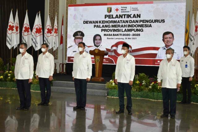 Onlinekoe.com, Bandar Lampung – Komandan Korem 043/Garuda Hitam Brigjen TNI Drajad Brima Yoga, S.I.P., M.H. menghadiri acara pelantikan dewan kehormatan dan pengurus PMI Provinsi Lampung masa bakti 2020-2025 oleh Ketua Umum PMI Pusat Dr. Drs. H. Muhammad Yusuf Kalla bertempat di Mahan Agung Jl. Dr. Susilo Kel. Sumur Batu Kec. Teluk Betung Utara Kota Bandar Lampung, Jumat 28/05/2021.