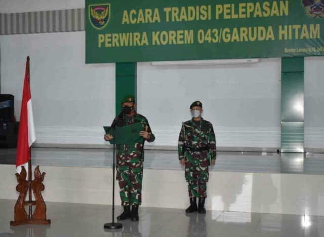 Onlinekoe.com – Danrem 043/Gatam Brigjen TNI Drajad Brima Yoga ,S.I.P., M.H pimpin tradisi satuan dalam rangka pelepasan perwira Korem 043/Gatam bertempat di Aula Sudirman Jl. Teuku Umar No.85, Penengahan, Kec. Tj. Karang Pusat, Kota Bandar Lampung, Lampung. Senin 19/7/2021.