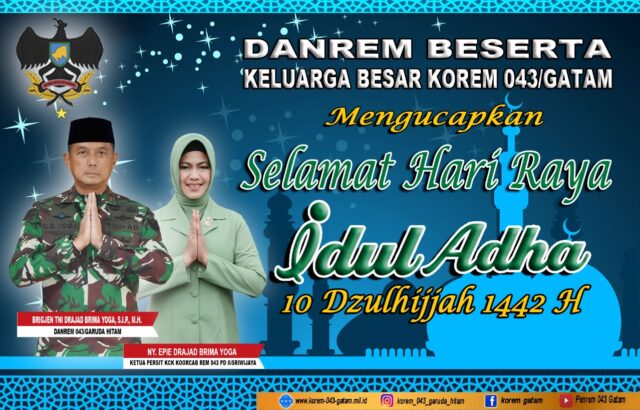 Onlinekoe.com – Danrem  043/Gatam Brigjen TNI Drajad Brima Yoga S.I.P.,M.H dan Ketua Persit KCK Koorcab Rem 043 PD II Sriwijaya Ny Efie Drajad Brima Yoga memberikan ucapan selamat Hari Raya Idul adha 1442H/ 2021M kepada keluarga besar Korem 043/Gatam dan jajaran serta seluruh masyarakat Lampung bagi yang merayakannya, Selasa (20/07/2021).