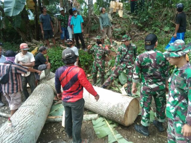 Dengan Kekuatan Semangat TNI dan Warga Tumbangkan Pohon Besar
