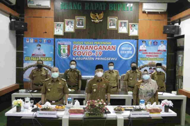 Dari Ruang Rapat Bupati, Senin (11/01), Bupati Pringsewu Sujadi didampingi Asisten Perekonomian dan Pembangunan Masykur Hasan, Kadis Pertanian Siti Litawati, Kadis Ketahanan Pangan Iskandar Muda, Kadis Kominfo Samsir Kasim serta Kabag Perekonomian Ediyanto, secara seksama mengikuti kegiatan yang dibuka oleh Presiden RI Joko Widodo dari Istana Negara.