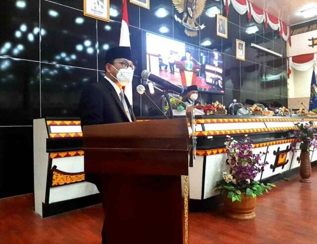 Onlinekoe.com, Kota Metro — Walikota Metro Wahdi bersama dengan Wakilnya Qomaru hadiri Rapat Paripurna DPRD agenda penyampaian SK DPRD Kota Metro tentang rekomendasi atas laporan keterangan pertanggung jawaban (LKPJ) Walikota Metro TA. 2020, di ruang sidang DPRD, Senin (12/04/2021).