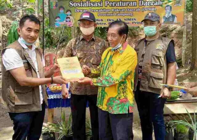 Onlinekoe.com, Pringsewu – Anggota Dewan Perwakilan Rakyat Daerah Lampung, Drs. FX. Siman sosialisasi Peraturan Daerah no. 01 tahun 2016 tentang Rembug Desa Dan Kelurahan Dalam Pencegahan Konflik Di Provinsi Lampung di Taman Wisata Lembah Akasia Pekon Sukoharjo 1 Kecamatan Sukoharjo Kabupaten Pringsewu, Minggu (4/4/2021)