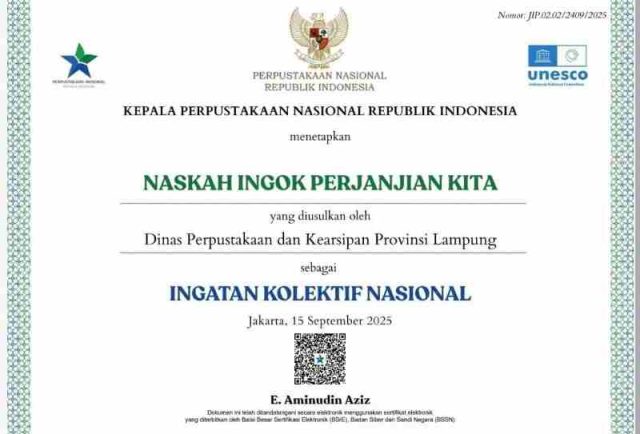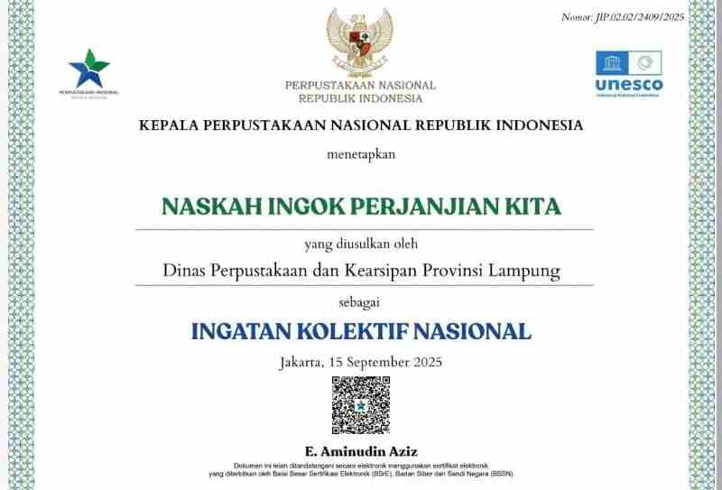 Lampung — Prestasi membanggakan kembali diraih oleh Provinsi Lampung di kancah nasional. Dua naskah kuno asal Provinsi Lampung berhasil meraih Sertifikat IKON (Ingatan Kolektif Nasional) Tahun 2025 dari Perpustakaan Nasional Republik Indonesia (Perpusnas RI).