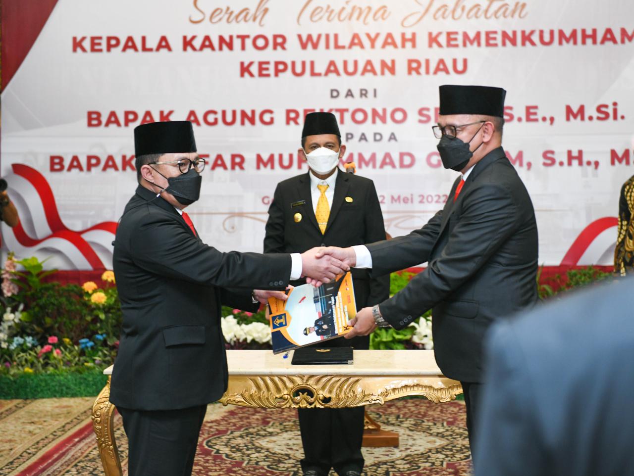 Onlinekoe.com | Tanjungpinang – Gubernur Kepulauan Riau H. Ansar Ahmad memimpin acara Serah Terima Jabatan (Sertijab) Kepala Kantor Wilayah Kementrian Hukum dan Hak Asasi Manusia (Kemenkumham) Provinsi Kepulauan Riau dari Rektono Seto, SE, M.Si kepada Saffar Muhammad Godam, SH. MH bertempat di Gedung Daerah Provinsi Kepri, Tanjungpinang, Kamis, (12/05).