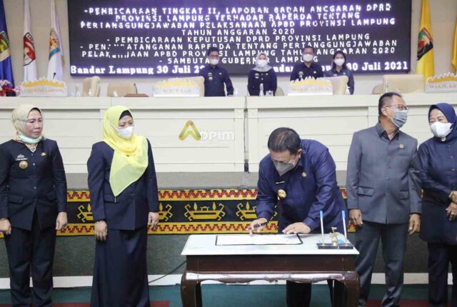 Onlinekoe.com, BANDAR LAMPUNG — Gubernur Lampung Arinal Djunaidi bersama Ketua DPRD Provinsi Lampung Mingrum Gumay dan 4 Wakil Ketua DPRD Lampung menandatangani persetujuan bersama Raperda Pertanggungjawaban Pelaksanaan APBD Provinsi Lampung Tahun 2020 di Ruang Sidang DPRD Provinsi Lampung, Jum’at (30/7/2021).