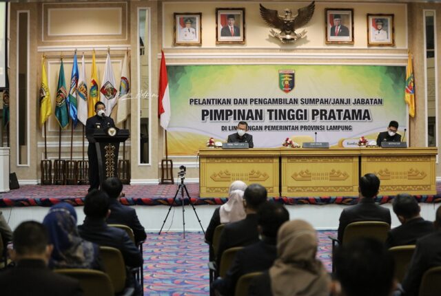 Onlinekoe.com, BANDAR LAMPUNG—Gubernur Lampung Arinal Djunaidi melantik dan mengambil sumpah jabatan 8 Pimpinan Tinggi Pratama (Eselon II), di Lantai III Balai Keratun pada Jumat (16/4/2020).