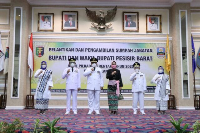 Onlinekoe.com, BANDARLAMPUNG—Gubernur Lampung Arinal Djunaidi atas nama Presiden Republik Indonesia, melantik sekaligus mengambil sumpah jabatan Agus Istiqlal dan Zulqoini Syarief sebagai Bupati dan Wakil Bupati Kabupaten Pesisir Barat di Balai Keratun Lt III, Komplek Perkantoran Gubernur Lampung, Senin, (26/04/2021)