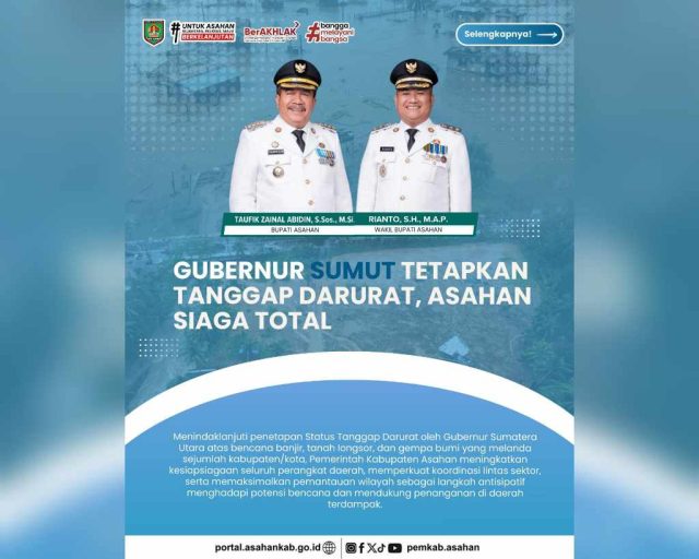 Pemerintah Kabupaten Asahan mengimbau masyarakat untuk tetap waspada, memantau informasi resmi pemerintah, dan segera melapor melalui kanal penanganan bencana apabila menemukan situasi darurat di lingkungan masing-masing. Sinergi dan kewaspadaan bersama diharapkan dapat meminimalkan risiko serta menjaga keselamatan masyarakat selama masa tanggap darurat ini.(SN)