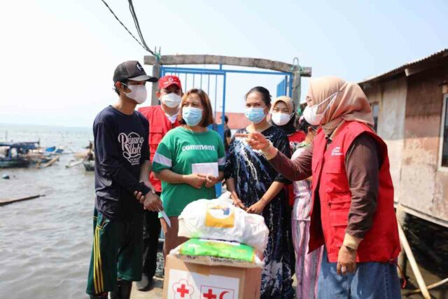 Onlinekoe.com, BANDAR LAMPUNG — Ketua Palang Merah Indonesia (PMI) Provinsi Lampung Ibu Riana Sari Arinal membagikan sejumlah paket bantuan kepada korban bencana ombak pasang, di Kelurahan Kangkung, Kecamatan Bumi Waras, Bandarlampung, Jum’at (30/7/2021).