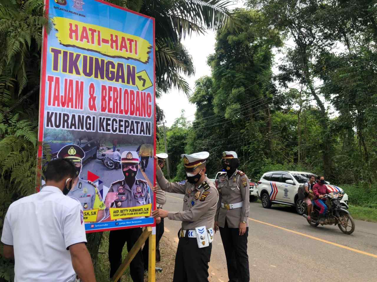 Onlinekoe.com, Muba -Guna mencegah Rawannya kecelakaan, membuat Satuan Lalu Lintas Polres Muba melakukan Pemasangan Himbauan dibeberapa titik Jalan Timur kabupaten Musi Banyuasin-Provinsi Jambi dan Lintas Tengah Musi Banyuasin-Kota Lubuk Linggau.