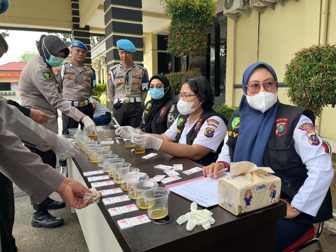 Hadir di tempat dan menjalani Tes Urine Kapolres Sergai AKBP Jhon HR. Sitepu, S.IK., M.H., didampingi Wakapolres Kompol Dr. Rudy Candra, S.H., M.H., dan Para PJU serta Personel Polres Sergai.