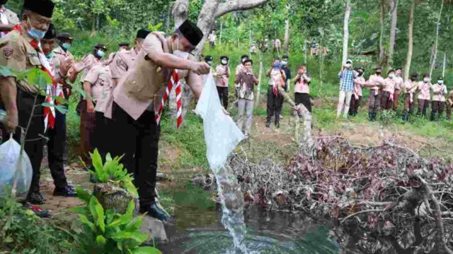 Penebaran ikan di embung pangonan bumi perkemahan setelah acara Pelantikan Pengurus Pramuka Peduli Gerakan Pramuka Kwartir Cabang Pringsewu, periode 2021 – 2025. dihadiri Unsur Majelis Pembimbing Kwarcab Pringsewu, Kadispora Pringsewu, Jahron.S.Pd. Kadisdik Hipni, SE.M.M Kadis Kominfo, Samsir Kasim, Waka 7.Bidang Abdimasgana A.Andoyo, Para Ka Kwarran serta DKC Kwarcab Pringsewu.