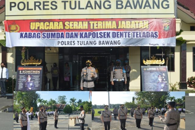 Onlinekoe.com – Polres Tulang Bawang menggelar upacara serah terima jabatan (sertijab) Kabag Sumda dan Kapolsek Dente Teladas.