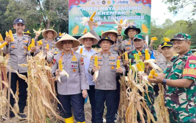 Onlinkoe.com, (Tanjungpinang) – Komitmen Polresta Tanjungpinang dalam mendukung program ketahanan pangan nasional terus diwujudkan secara konkret. Sejalan dengan Asta Cita Presiden Republik Indonesia Prabowo Subianto, Polresta Tanjungpinang melalui Polsek Bukit Bestari menggelar Panen Raya Jagung Pipil Kuartal I Tahun 2026 di kebun pertanian Tanjung Siambang, RT 02 RW 01, Kelurahan Dompak, Rabu (28/1/2026).