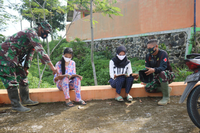 Di sela-sela kesibukannya menjalankan tugas TMMD, masih sempat kumpulkan anak-anak yang ada di desa sasaran, ajak bermain sambil memberikan materi wawasan kebangsaan kepada mereka.