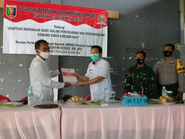 Onlinekoe.com, Bandar Lampung – Ketua DPRD Provinsi Lampung Mingrum Gumay menggelar sosialisasi peraturan daerah Provinsi Lampung nomor 3 tahun 2020 tentang Adaptasi kebiasaan baru dalam pencegahan dan pengendalian Corona Virus Disease (Covid) 19 di Kecamatan Trimurjo Kabupaten Lampung Tengah (Rabu, 27 Januari 2021).