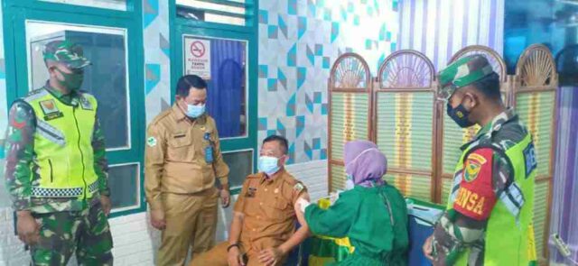 Petugas yang melakukan penyuntikan vaksin sinovac tersebut , turut juga di bantu dalam pengawasan dan pengamanan jalannya proses kegiatan itu dari aparat koramil 421-01/Kedondong, Selasa (09/03/21)