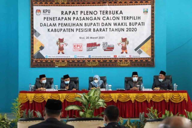 Penetapan tersebut disampaikan dalam rapat pleno terbuka penetapan Paslon terpilih dalam pemilihan Bupati dan Wakil Bupati Kabupaten Pesibar tahun 2020 yang digelar oleh Komisi Pemilihan Umum (KPU) Kabupaten Pesibar di GSG Selalaw, Kecamatan Pesisir Tengah, Sabtu (20/3).