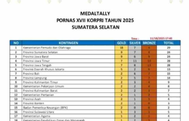 Palembang – Semangat juang dan dedikasi tinggi aparatur sipil negara (ASN) asal Sai Bumi Ruwa Jurai kembali berbuah manis. Kontingen Lampung sukses menorehkan prestasi gemilang dalam Pekan Olahraga Nasional Korpri (Pornas Korpri) XVII Tahun 2025 yang digelar di Palembang, Sabtu (11/10/2025).