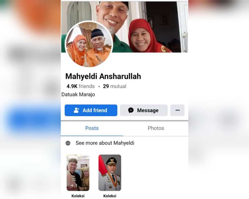 Teks Foto: Tangkapan layar akun FB bodong berkedok penipuan atas nama Gubernur Sumbar Mahyeldi Ansharullah.