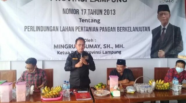Onlinekoe.com – Ketua DPRD Provinsi Lampung Mingrum Gumay menggelar sosialisasi peraturan daerah (Perda) nomor 17 tahun 2013 tentang Perlindungan Lahan Pertanian Pangan Berkelanjutan di Kecamatan Gunung Sugih, dari tanggal 18 hingga20 Juni 2021.