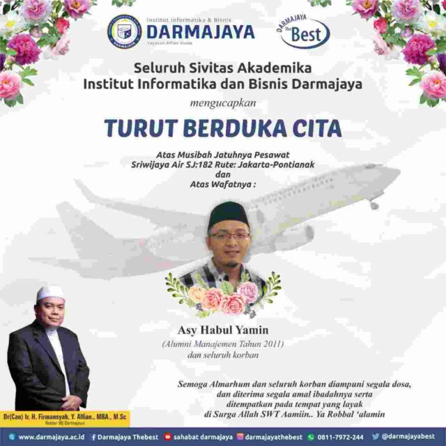 Sementara, Rektor IIB Darmajaya, Dr. (Can). Ir. H. Firmansyah YA., MBA., MSc., mengucapkan turut berduka cita atas musibah yang menimpa dunia penerbangan di Indonesia.