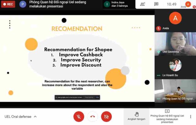 Hal ini setelah dilaksanakannya presentasi pada Senin, 9 Maret 2021 melalui daring. Olvi Geovinna mengangkat judul penelitian The Influence of Cashback, Discount, and Security Toward Intention to Use Shopee e-Wallet.