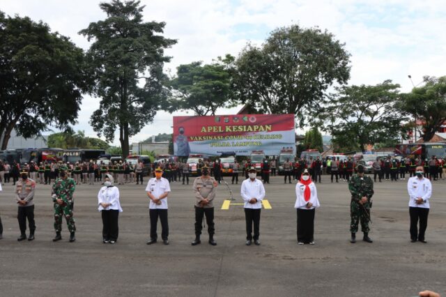 Onlinekoe.com, Bandar Lampung — Polda Lampung bersama Pemerintah Provinsi Lampung dan stakeholder terkait melaksanakan Apel Kesiapan Vaksinasi Covid-19 Keliling, bertempat di Lapangan Saburai-Enggal Bandar Lampung, Senin (21/7).