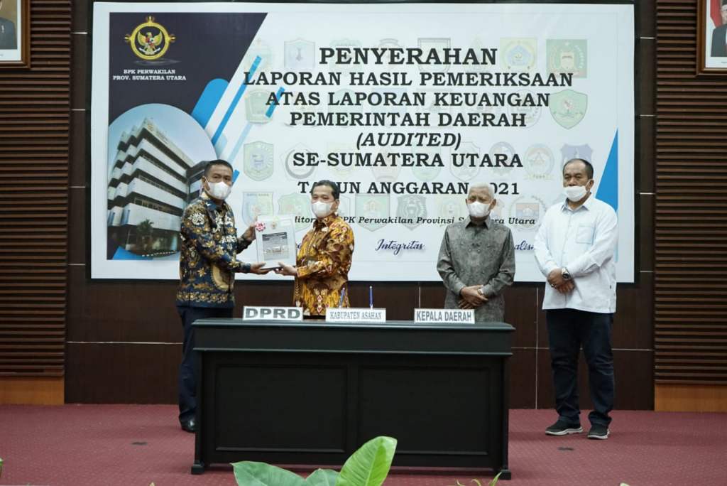 Onlinekoe.com|Asahan Sumut-Pemerintah Kabupaten Asahan kembali meraih predikat Opini Wajar Tanpa Pengecualian (WTP) dari Badan Pemeriksa Keuangan (BPK) atas Laporan Keuangan Pemerintah Daerah (LKPD) Kabupaten Asahan tahun anggaran 2021, bertempat di Aula BPK RI Perwakilan Sumatera Utara Kamis (28/04/2022).