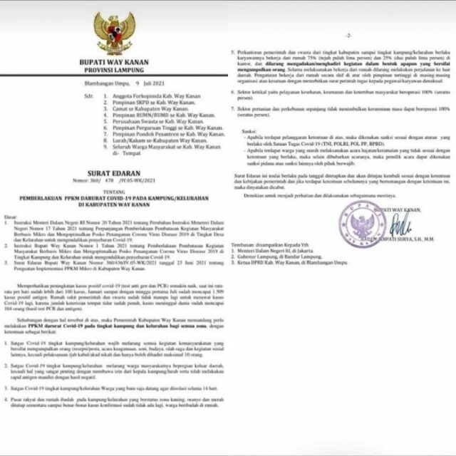 Onlinekoe.com, Way Kanan – Pemerintah Daerah Kabupaten Way Kanan secara resmi mengeluarkan surat edaran pemberlakuan pembatasan kegiatan masyarakat (PPKM) darurat Covid-19 terhitung pada Tertanggal 09 Juli 2021 pemberlakuan PPKM darurat Covid-19 tersebut ditujukan kepada tingkat kampung dan kelurahan bagi semua zona. Hal tersebut tertuang Dalam Surat edaran Bupati Way Kanan Nomor Nomor: 360/ 478 /IV.05-WK/202 tentang Pemberlakuan PPKM Darurat Covid-19 Pada Kampung/Kelurahan di Kabupaten Way Kanan.
