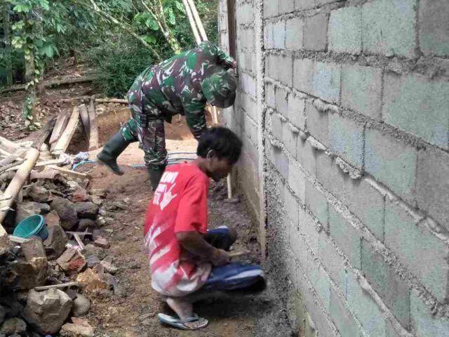 Banjarnegara – Pemlesteran dinding rumah di RTLH yang direhab melalui gelaran TMMD Reguler ke-111 Kodim 0704/ Banjarnegara di desa Kebutuhjurang Kecamatan Pagedongan Kabupaten Banjarnegara, terus dilakukan oleh TNI dan warga. Minggu (20/6/21).