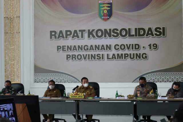 Onlinekoe.com, Bandar Lampung — Gubernur Arinal Pimpin Rapat Konsolidasi Penanganan Covid-19 pada Kabupaten/Kota di Provinsi Lampung bersama Forkopimda dan Bupati/Walikota secara virtual, bertempat di Rumah Dinas Gubernur – Mahan Agung, Senin (26/07/2021).