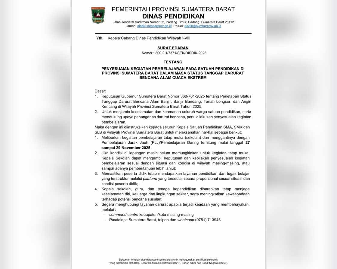 Sementara itu, Kepala Dinas Pendidikan Sumbar Habibul Fuadi, menjelaskan bahwa Surat Edaran Nomor 300.2.1/7371/SEK/DISDIK-2025 telah diteruskan kepada seluruh kepala satuan pendidikan SMA, SMK, dan SLB melalui cabang dinas masing-masing.