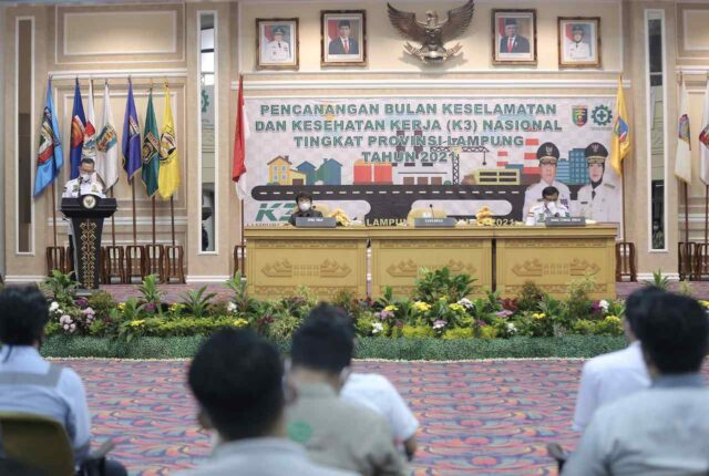 Onlinekoe.com, BANDARLAMPUNG —- Gubernur Lampung Arinal Djunaidi minta terus digelorakannya semangat Keselamatan dan Kesehatan Kerja (K3) kepada semua sektor usaha meski di tengah pandemi Covid-19. Hal ini sesuai dengan amanat Menteri Ketenagakerjaan Ida Fauziyah, pada pencanangan bulan K3 tahun 2021 ini.