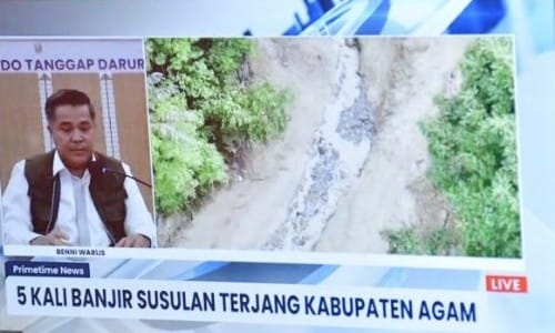 Onlinekoe.com | Agam – Banjir kembali menerjang kawasan Pasa Maninjau, Kabupaten Agam, bertepatan dengan pergantian tahun. Bupati Agam Benni Warlis, memaparkan kondisi terkini serta langkah penanganan bencana yang dilakukan Pemerintah Kabupaten (Pemkab) Agam bersama Forum Koordinasi Pimpinan Daerah (Forkopimda), pada Kamis (1/1/2026).